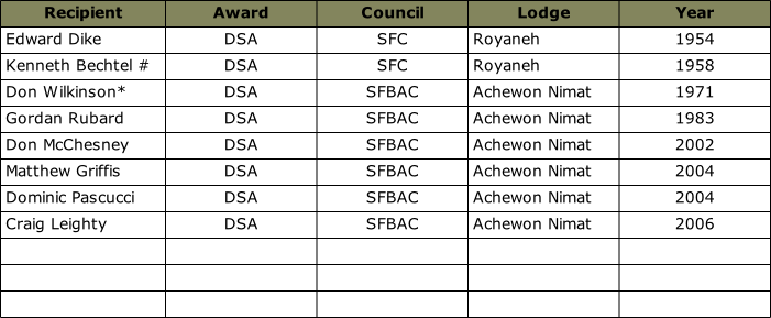 Between 1940 and 2009, 2 members of the Royaneh Lodge and 6 members of Achewon Nimat Lodge have been awarded the Distinguished Service Award. Nationwide less than 750 Arrowmen have been awarded the DSA. Below is the list of DSA recipients that have received the award in our council.